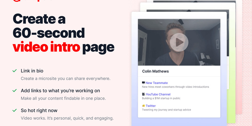 Record a video, add links to what you’re working on, and voilà, you have a free Snaptro page! Specific use cases detailed for sales reps, job seekers, and AirBnb hosts.