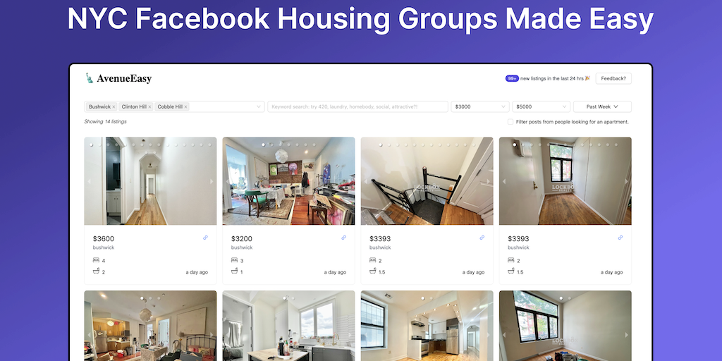AvenueEasy imposes structure on the chaotic universe of NYC Facebook housing groups! Through scraping and GPT magic, we pull listings from numerous groups and allow you to filter by price, location, n