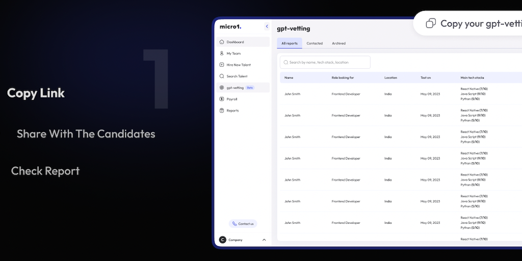 a 25 minute, gpt-powered test for the fastest & most accurate technical assessment. after the candidate takes the test, you receive a report which includes a rating out of 10 per skill, an explanation