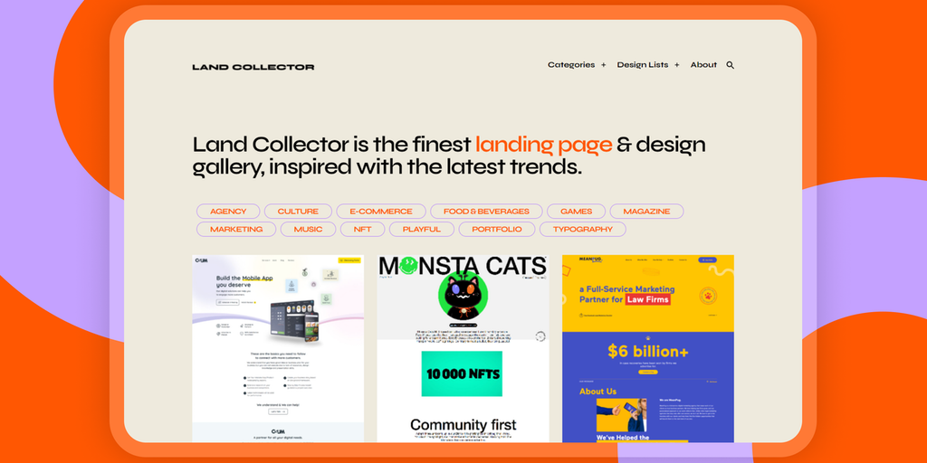 Land Collector is the finest landing page & design lists resource, inspired by the latest trends. You can improve your design research process with a stunning gallery of websites, followed by categori
