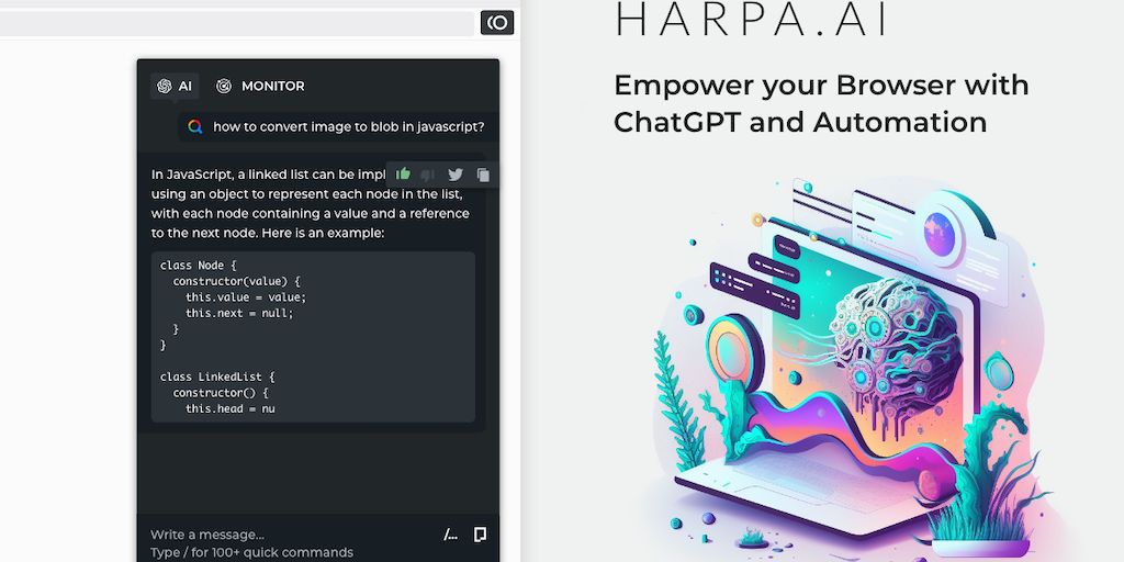 HARPA AI integrates ChatGPT and automation into your Browser: from answering Google Search queries to writing tweets, blog posts, email replies, monitoring prices & data on websites. It comes with 100