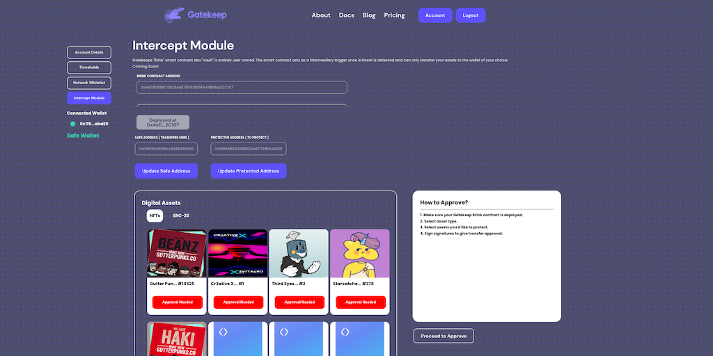 Gatekeep is a theft prevention system for crypto assets. When a theft is detected the platform works in conjunction with user deployed contracts to transfer the affected assets to a safe wallet before