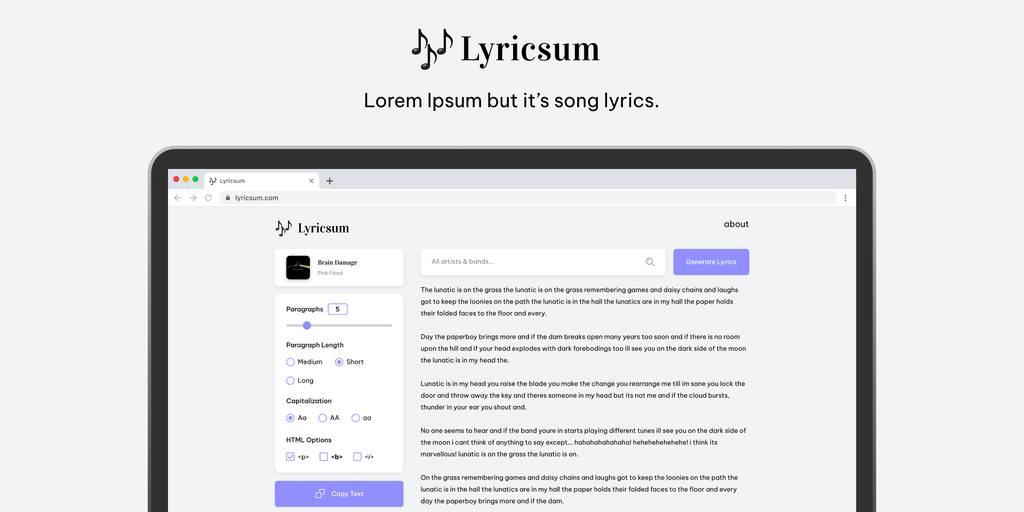 Lyricsum - Lorem Ipsum but it's song lyrics | Product Hunt
