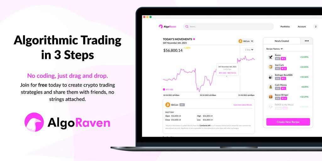 AlgoRaven empowers literally anyone to create, run, and share complex trading algorithms with a simple drag-and-drop interface, built-in tutorials, and social features.