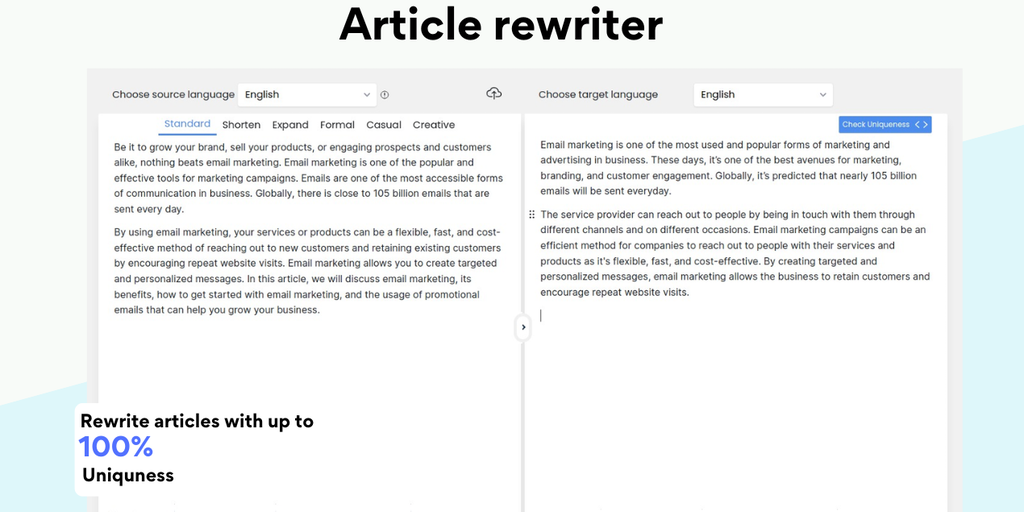 AISEO's Article rewriter simply helps you with rewriting content while preserving the meaning of the content. It does this at a blazing speed, using GPT-3 and other AI engines.