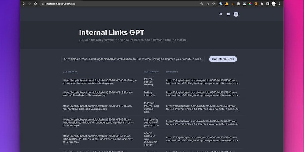 Automate finding internal links placements! This app uses GPT4 to analyze pages and find relevant link placements for your readers and Google. Stop wasting time on internal links and get back to the m