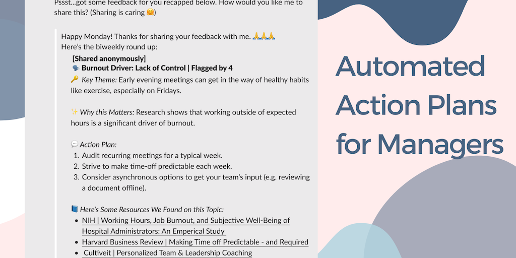 Burnout Bot surfaces insights, action plans, and suggestions to address burnout on teams, all on Slack. Recs are based on team behavior (not noisy surveys). Users get analytics on work sustainability+