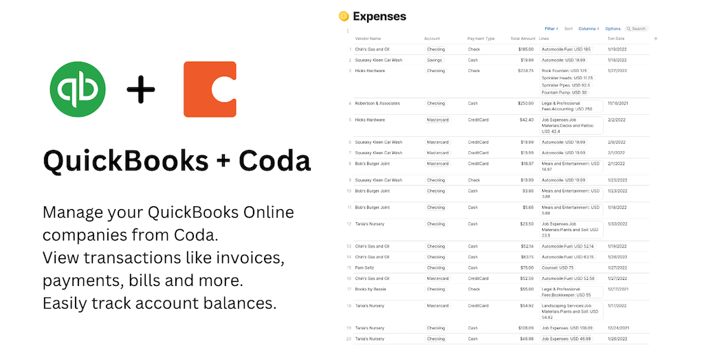Revolutionize accounting with QuickBooks + Coda 🚀 Craft custom workflows ✨ Monitor expenses 💸 Manage transactions 📊 Invoices & POs 📝 Multi-company data 🌐 Run reports 📈 Boost customer and vendor relati