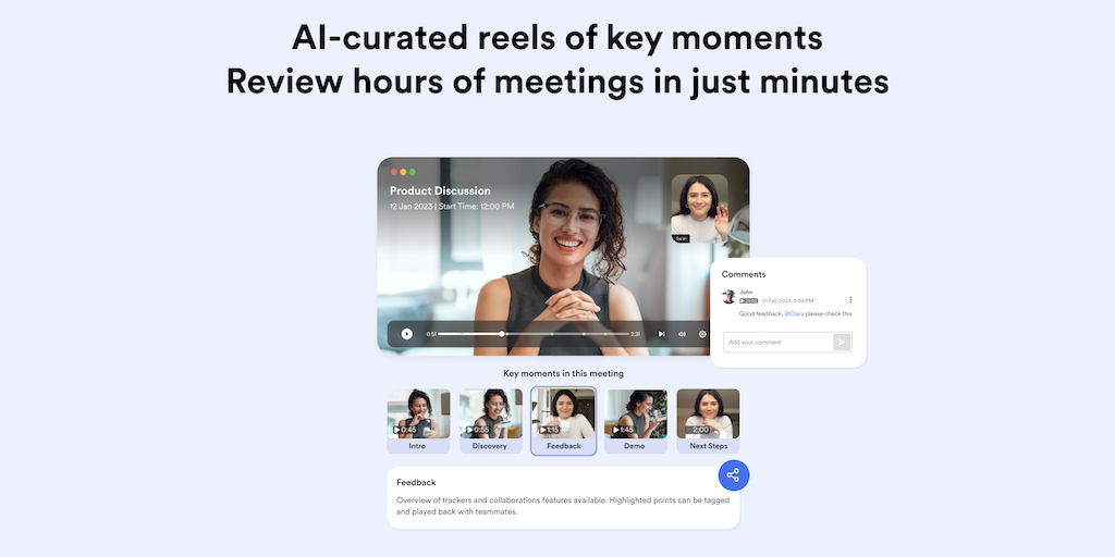 Introducing AI-curated reels that condense hours of meetings into minutes of key moments - All recordings, transcripts, and insights organized in an easily searchable library - Meeting summaries & act
