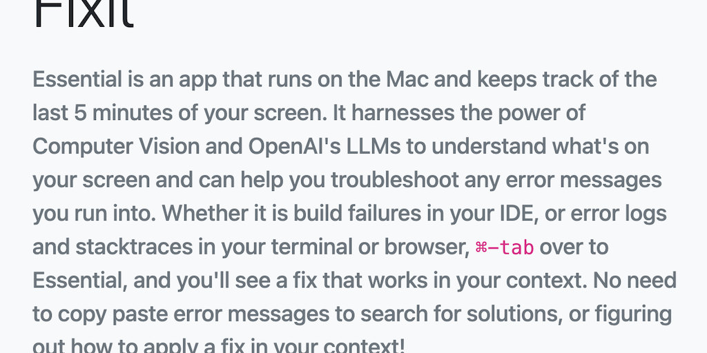 Essential is an open source MacOS app built for developers. It is like having a second set of eyes on your screen to help you be more productive. It can suggest code fixes to error messages you see on