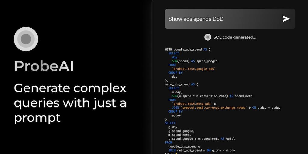 ProbeAI helps in: ✨ Auto-generating complex SQL code 🔎 Identifying relevant tables for your question 🛠️ Optimizing & fixing SQL code in real-time 🧠 Adapting to business-specific definitions 🔌 Supporti