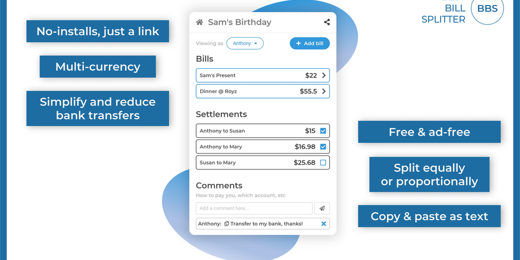 BestBillSplitter is a bill-splitting web app that covers the corner cases not covered by most others. Split charges equally or proportionally, use multiple currencies, upload receipts, use multiple cu