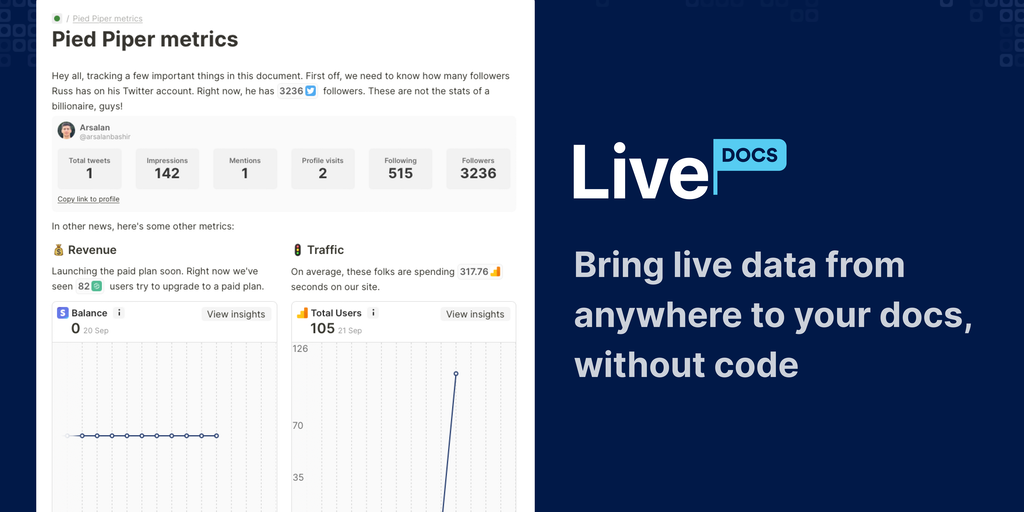 Livedocs lets you bring live data from your existing tools into your documents, so anybody on your team can track vital metrics like retention, MRR, and web traffic in under 90 seconds — no code or da