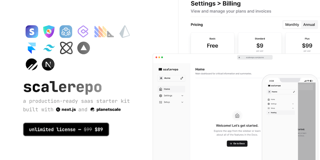 Scalerepo is a production-ready SaaS starter kit built with Next.js and PlanetScale.