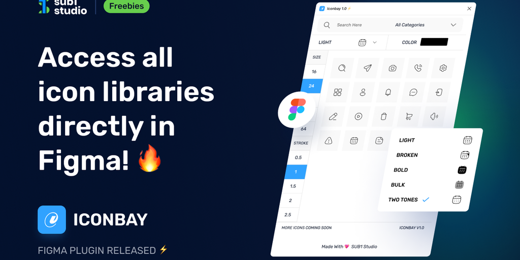 Iconbay Figma plugin offers fully customized style, color, size, and stroke directly on Figma!. More icons will be added very soon! 🔥