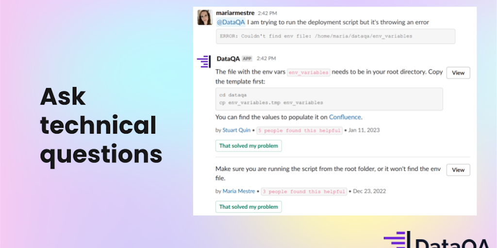 DataQA takes all the knowledge inside your Slack to create your own version of Stack Overflow. So your developers can find the information they need faster than ever. 🚀