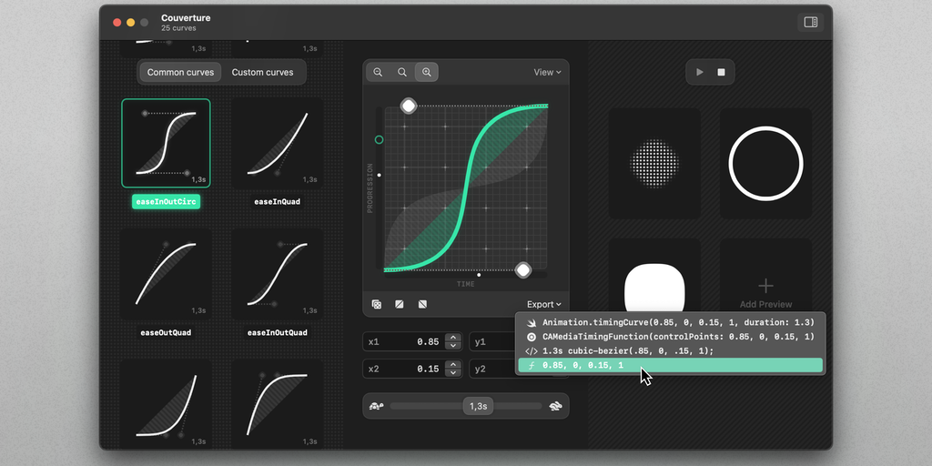 Couverture is an easing curve editor that supercharges your animations in apps, mockups and websites. Easing or timing curves are made to specify the rate of change in an animation over time. The app