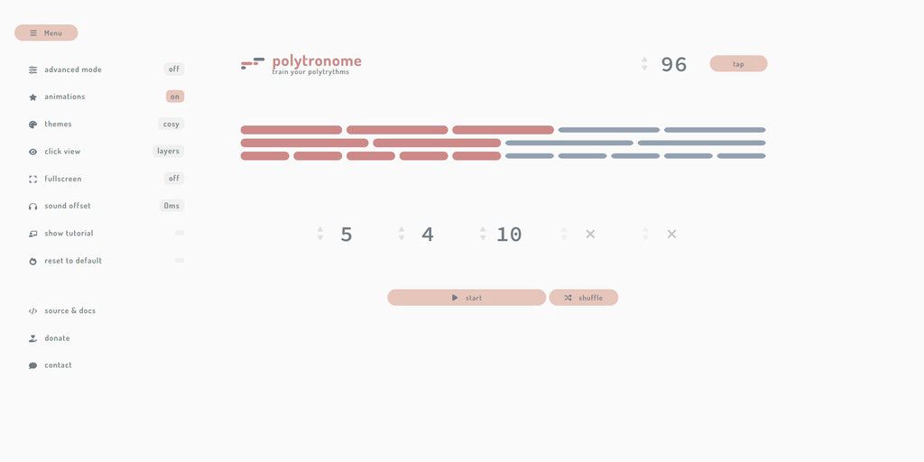 Polytronome is an easy way to visualize (poly)rythms. Use it to discover new rythms, challenge yourself to play along, or simply enjoy the sounds you created!