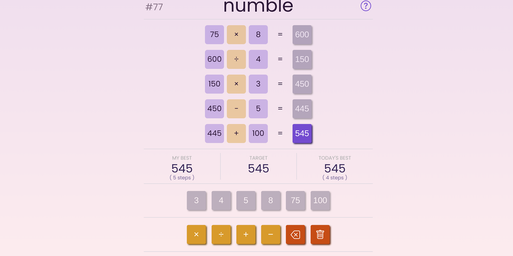 Numble is a daily number challenge inspired by Wordle and the game show Countdown.