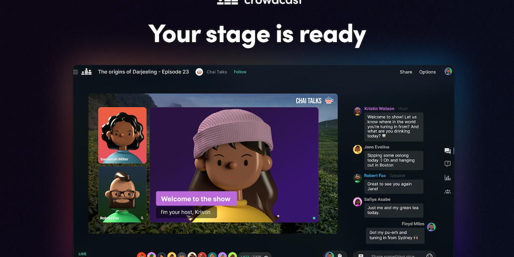 Host live shows & online events that stand out with Crowdcast v2.0 — Design your stage with backgrounds and logos. Cue animated overlays, videos, and media with the new built-in studio. Co-host events