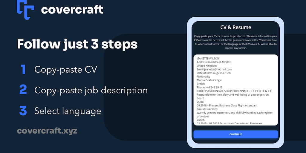 Covercraft harnesses the power of GPT-4 to create highly tailored cover letters in under 1 minute whilst significantly increasing your chances to land an interview.