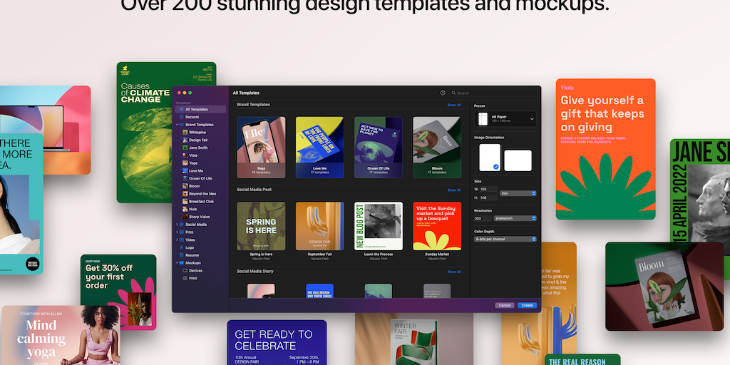 Pixelmator Pro 3.0 lets you create eye‑catching designs with ease using stunning design templates and see them come to life in beautiful, fully‑customizable mockups.