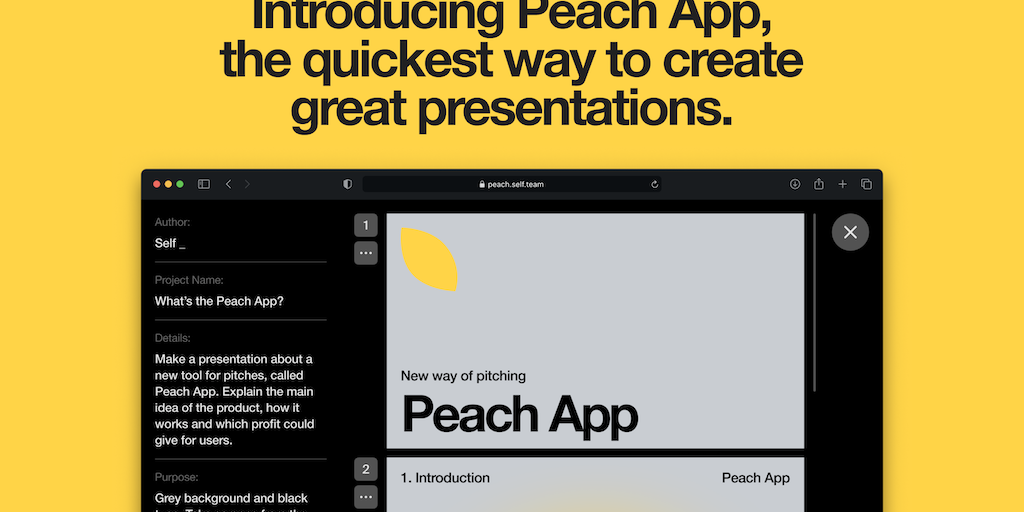 Peach App is an AI-powered presentation generator. Type in all you want and get the unique slides with generative texts. No complicated settings, no rules, just your ideas and their implementation.