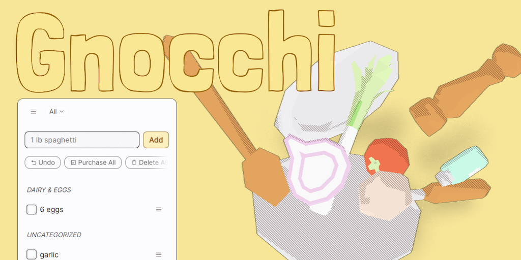 Gnocchi is a cooking app that focuses on what matters and keeps everyone on the same page. Make your weekly list, collect your favorite recipes, and track your pantry. It's local-first and free foreve