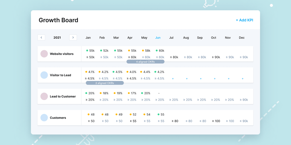 Don't miss another growth goal. The Growth Board is a cross-functional view of the KPIs that make up your organization's funnel and contribute to revenue growth. Track targets vs actuals for these KPIs over time, and understand what's planned to achieve them.