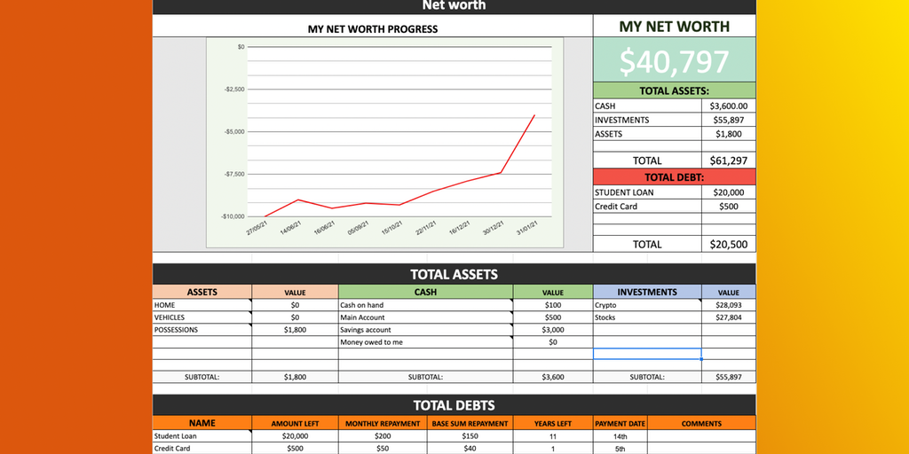 A flexible template that allows you to gamify your personal finances by keeping track of your net worth month-by-month which also keeps track of your assets, debts, investments and your monthly budget