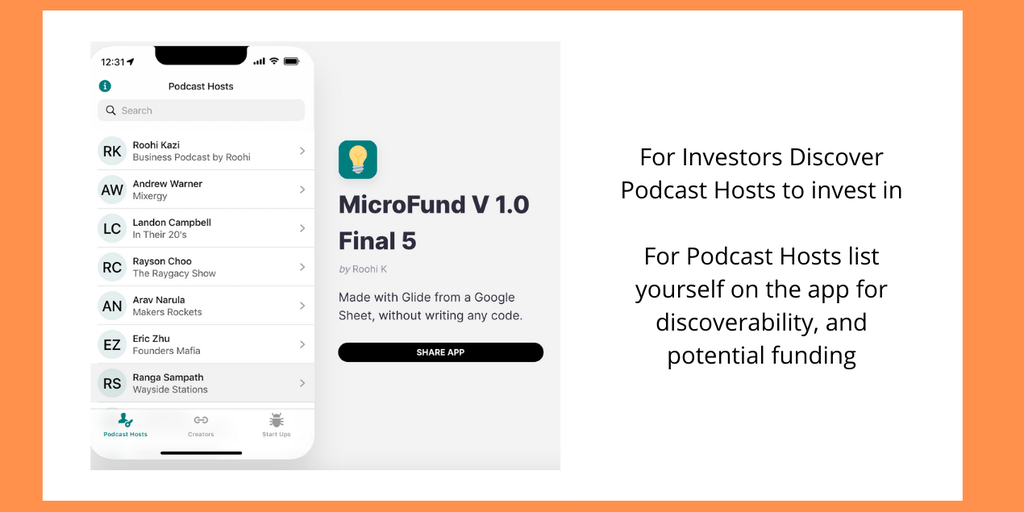 It’s an information app that connects investors to startups, podcasters, and creators to help them raise micro funding, and helps investors find and discover new investment opportunities in the creato