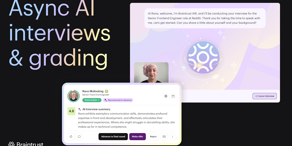 Braintrust AIR - the first end-to-end AI recruiter. Experience end to end AI assisted recruiting: job description generation, matching, screening, and now interviewing.