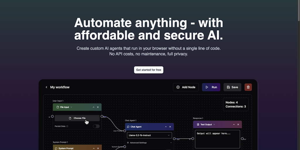 Create and run AI workflows directly in your browser with zero API costs. Our visual editor requires no coding, while our browser-native technology enables unlimited executions at a fixed price. Build