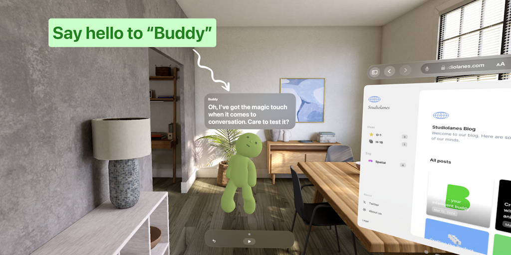 Buddy is the first AI companion designed for the Vision Pro. To start a conversation with Buddy, simply start talking :) Buddy lives in your augmented reality and can co-exist with other apps. Give Bu