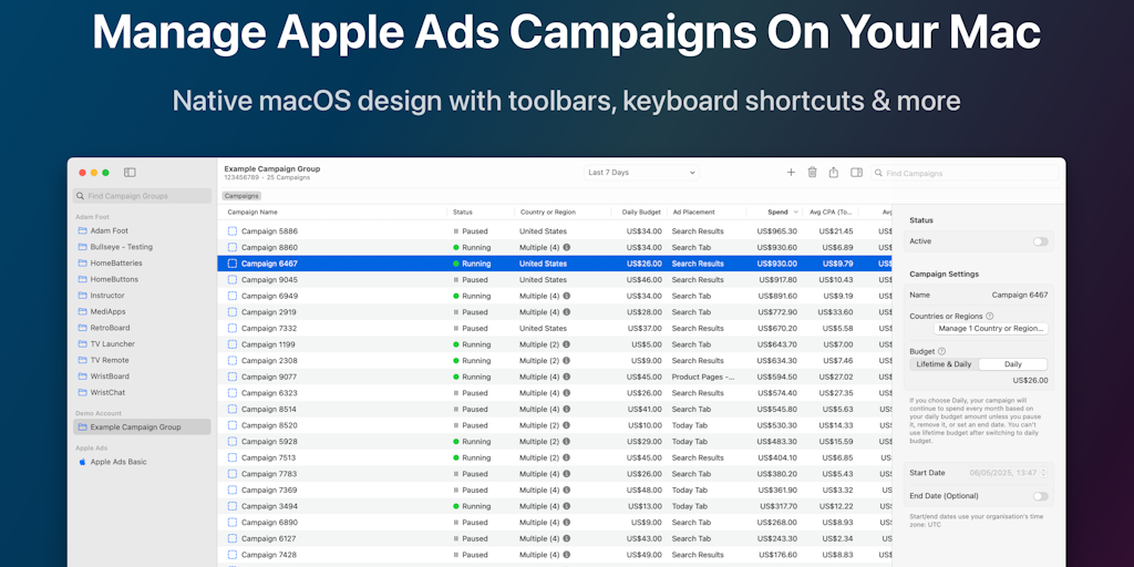 Bullseye is a native Mac app that enables developers and marketers to manage their Apple Ads (previously Search Ads) campaigns in an easy-to-use format. With built-in commands, multiple windows and mu
