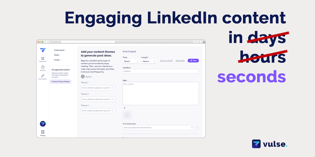 Vulse helps you maximize LinkedIn activity by offering live analytics, post planning, and content creation in seconds.