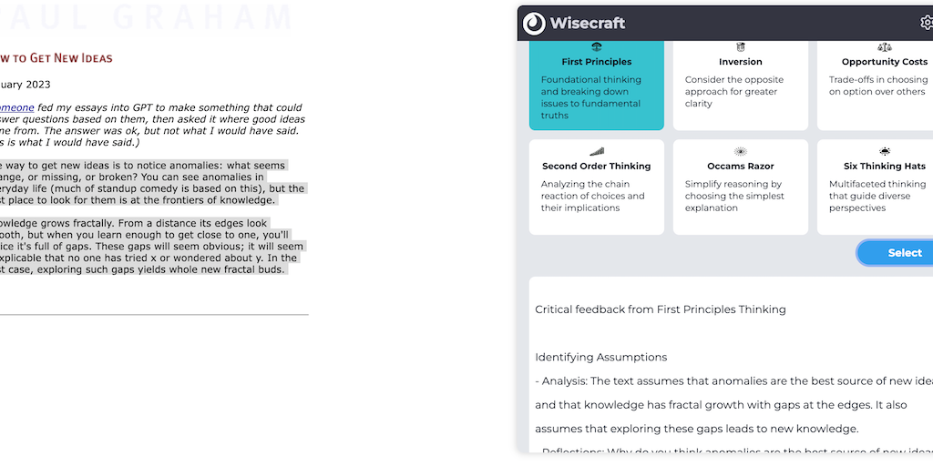 Wisecraft allows you to apply mental models on highlighted text in google chrome. You can choose from 6 different mental models that offers different perspectives and enables further thinking and refl