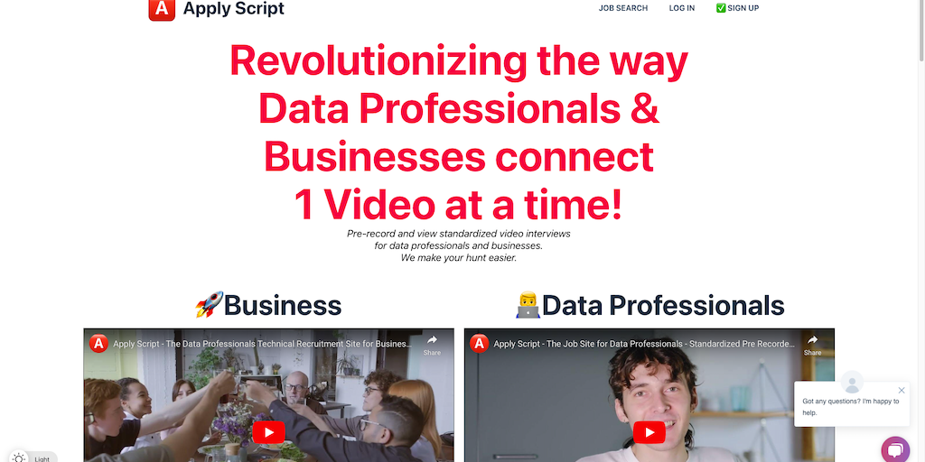 Q. DATA PROFESSIONAL: Are you tired of 5-17 rounds of interviews? Q. BUSINESS: Are you tired of hiring someone takes months to half a year? 🅰️: Apply Script connects business and data professionals vi