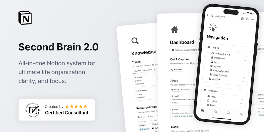 Second Brain 2.0 is your all-in-one Notion template to organize your life and free your mind. Capture your ideas, plan your projects, track your goals, and save unlimited knowledge in a simple-to-use