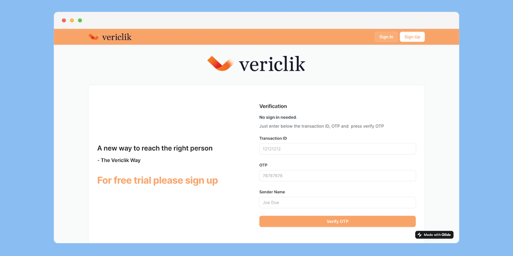 Vericlik ensures secure and verified transactions with one-time passcodes. Send packages, share documents, or grant access with confidence. Ensure the right person is on the other end, every time. Sta