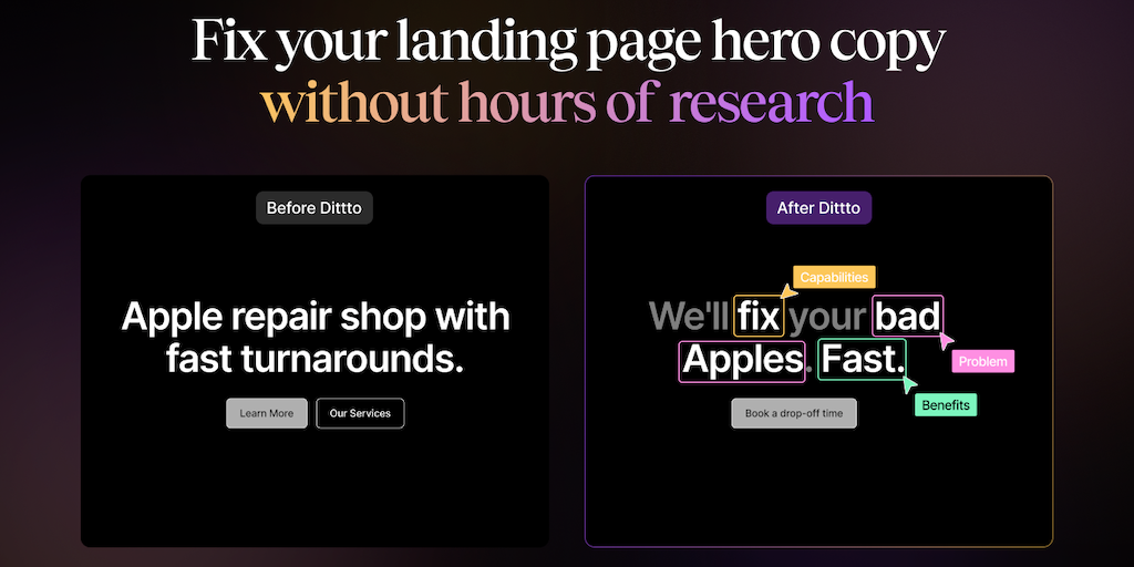 Stop wasting website traffic with confusing hero copy. Dittto is the only AI trained on high-converting SaaS websites and fine-tuned by pro copywriters. Audit your positioning, get brand voice recomme