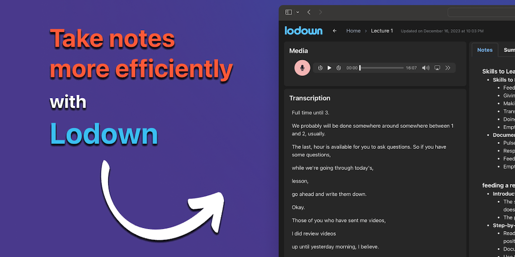 Lodown records and transcribes audio into notes, allowing students to easily review information from their lectures. Focus on your lecture. Lodown takes care of everything else.