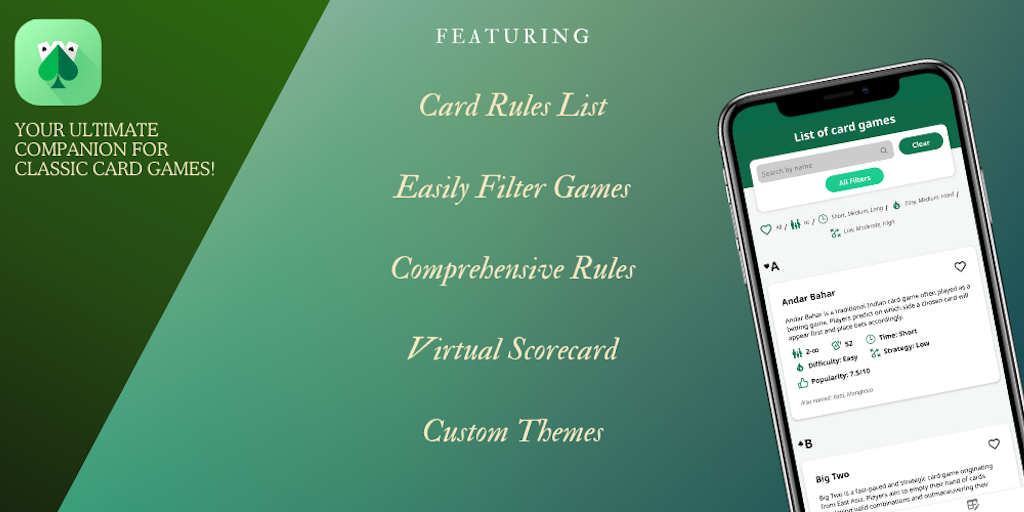 Discover the ultimate card gaming companion with CardRules+! Access rules for Poker, Bridge, Rummy & more, and effortlessly keep score with our intuitive scorecard feature. Try it today and revolution