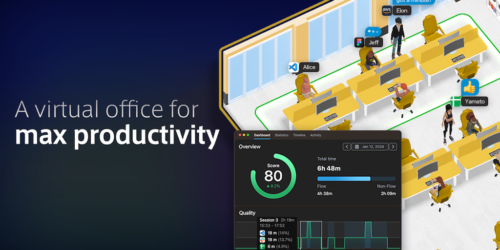 Undesk combines a collaborative virtual office & a private productivity tracker. Try Undesk with your team. They'll come for the office energy. They'll stay for the personal productivity.