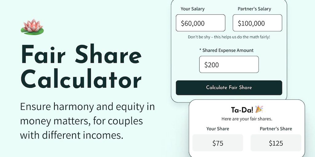 Fair Share Calculator for couples with different incomes. It helps split expenses fairly based on what each earns. Just input both salaries and the expense, and it shows each person's fair share.