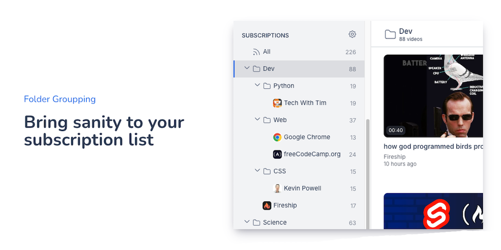 Add your YouTube subscriptions and videos into Velty and organize them into folders and sub-folders to easily find what to watch right now.