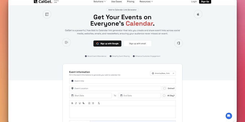 CalGet is a powerful, free Add to Calendar link generator that lets you create and share event links across social media, websites, emails, and newsletters, ensuring your audience never misses an even
