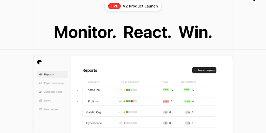 Stay ahead of the game with Campana, the all-in-one tool designed to keep you informed about your competitors' activities. Each week, receive a report on their website updates, newsletters, social med