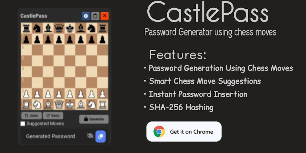 CastlePass is a free, open-source Chrome extension that creates strong passwords using chess moves. The extension works by turning the chess moves you play against a bot into a secure password using s