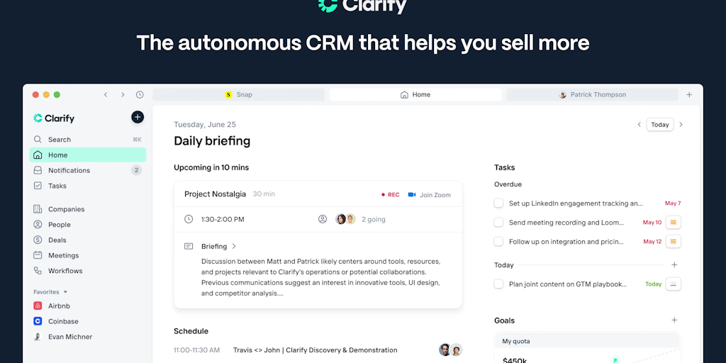 Clarify is the autonomous CRM that helps founders and early-stage sellers build pipeline, close more deals, and spend less time on CRM busywork.